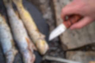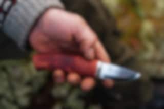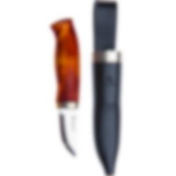 Skaftet er laget i beiset fjellbjørk og har et grep som passer små og mellomstore hender. Kniven blir levert med en slire i sort okselær med sikkerhetsinnlegg. Ta godt vare på kniven din og tørk av den etter bruk før den settes tilbake i sliren.