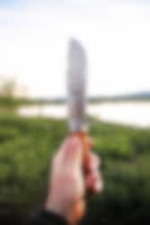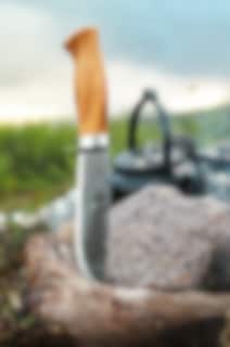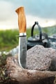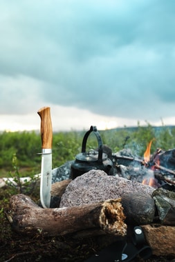 Villmarka lille har et knivblad med skandinavisk slibning og en holk i rustfrit stål. Det giver det traditionelle skaft ekstra styrke, som kniven har brug for ved brug. Knivbladet har vores signatur; en halvmånehakket ryg – til at løfte kaffekanden af bålet. Kniven er med skaft af oliventræ og fingerbeskytter.