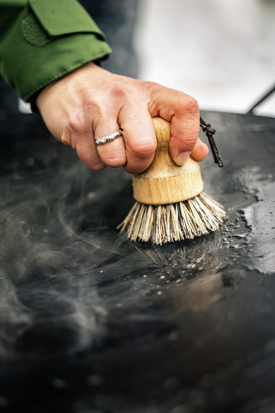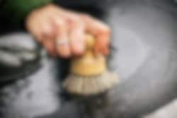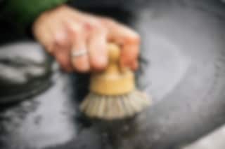 Oppvaskbørste i tre. Liten, praktisk og lett pakkebar med et stabilt grep selv om det blir vått. Våre kokeplater skal håndteres på samme måte som en støpejerns stekepanner. Varm opp vann i stekehellen og vask enkelt ved hjelp av børsten. Olje gjerne pannen etter bruk. Ikke bruk vaskemiddel. Størrelse 6 × 6 cm.