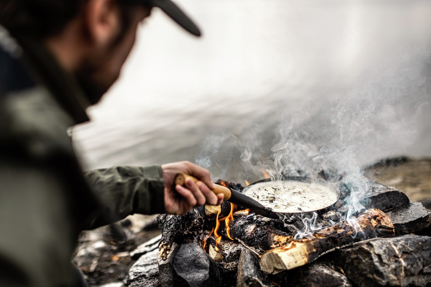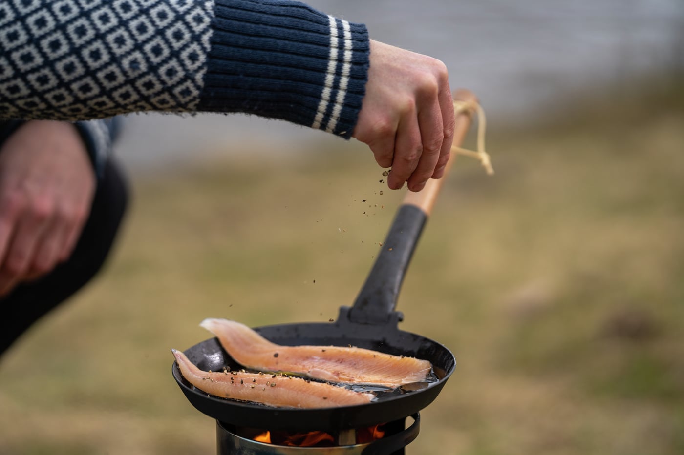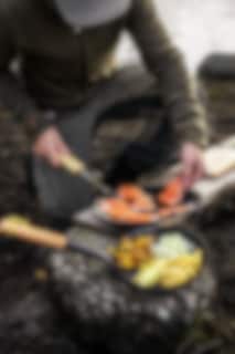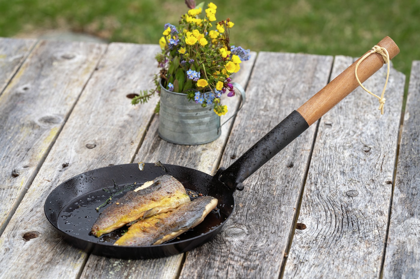 Vår lille og fleksible jaktpanne med sammenleggbart trehåndtak gjør den lett å ha med seg i sekken. Trehåndtaket gir sikker håndtering, enten det er over en gassflamme eller over åpen ild. Kjelen i varmvalset stål leveres fabrikksmurt. En trofast venn og verdsatt gave til jegere, fiskere og frilufts entusiaster Hällmark of Sweden har sitt opphav og merkevare fra det svenske land og fjell. Diameter 21 cm, vekt 0,65 kg.