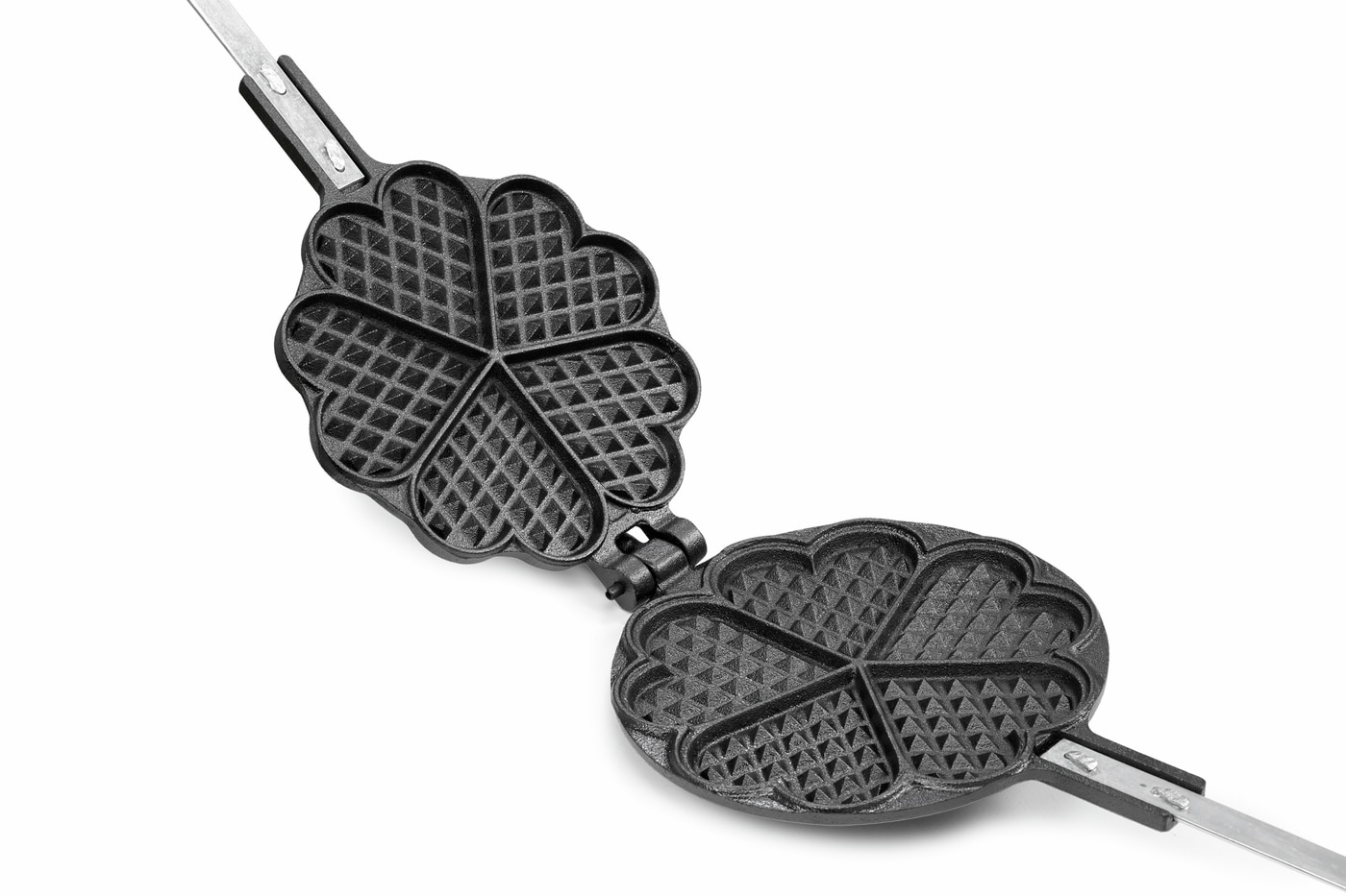Vaffeljern i støpejern med fem hjerteformede vaffelbiter til bruk over åpen ild. Vafler over åpen ild er et nyttig triks for å få barn til å sette pris på friluftsliv. Fungerer også over grillen. Trehåndtak og skaftlengde ca 45 cm. Størrelse ca 18 × 18 cm.