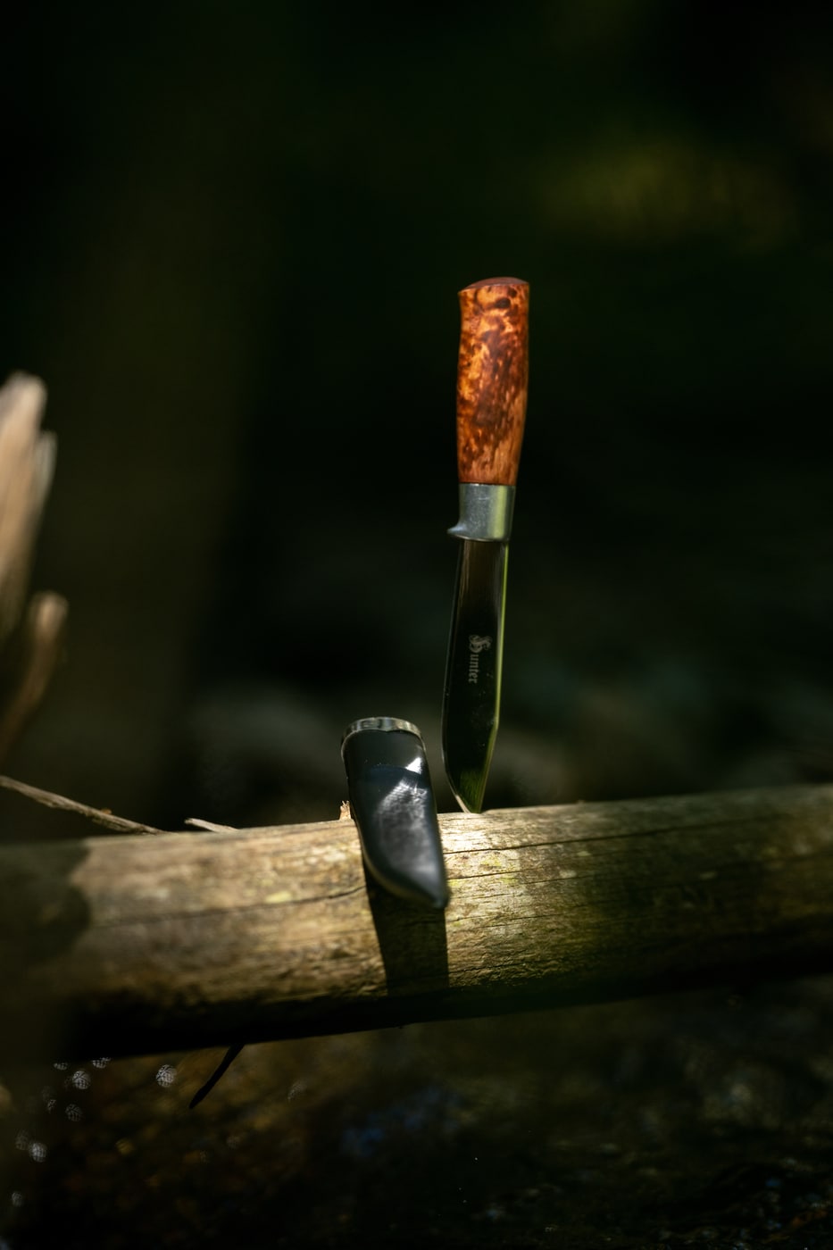 Knivbladet har et skandinavisk ligeslebet design. Etuiet er forstærket med et metalbånd der giver ekstra styrke. Kniven har desuden et støbt aluminiumshåndtag med indbygget fingerbeskytter, som øger sikkerheden, hvis du skulle miste grebet. Knivbladet er lavet af Sandvik 12C27-stål, kendt for sin holdbarhed og nemme slibning. Skaftet er lavet af olieret og bejdset masur birk. Kniven leveres med læderetui og en elegant gaveæske.
