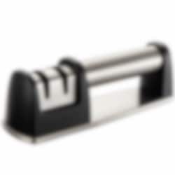 Brusletto knivsliber med 2 trin kan bruges til både europæiske og japanske knive. Den har keramiske hjul samt håndtag i plast indlagt med rustfrit stål.