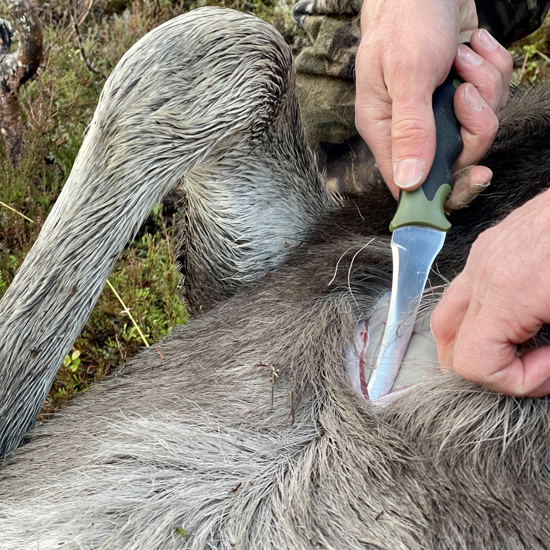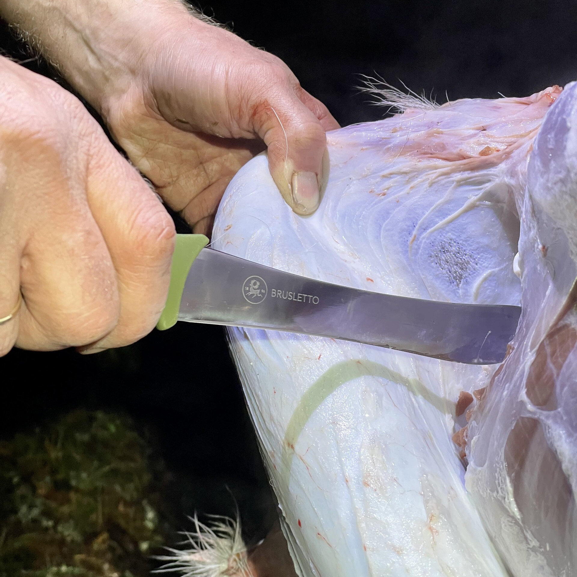 I de sidste tre år har vi haft fornøjelsen af at teste Bruslettos slagtesæt til slagtning af hjortevildt, og vi er meget tilfredse. Knivene har et stål, der holder sig skarpt, selv hvis man skulle skære i ben et par gange. Når knivene bliver sløve, er de lette at slibe med Bruslettos knivsliber, som har den rette vinkel til bladet. Håndtagene er gummibelagte, så de giver et godt greb, når du flår eller deler kødet. Det betyder, at du ikke bliver træt så hurtigt, selv når knivene bruges over længere tid. Vi hos Jegerbrødre kan på det varmeste anbefale Bruslettos slagtesæt.