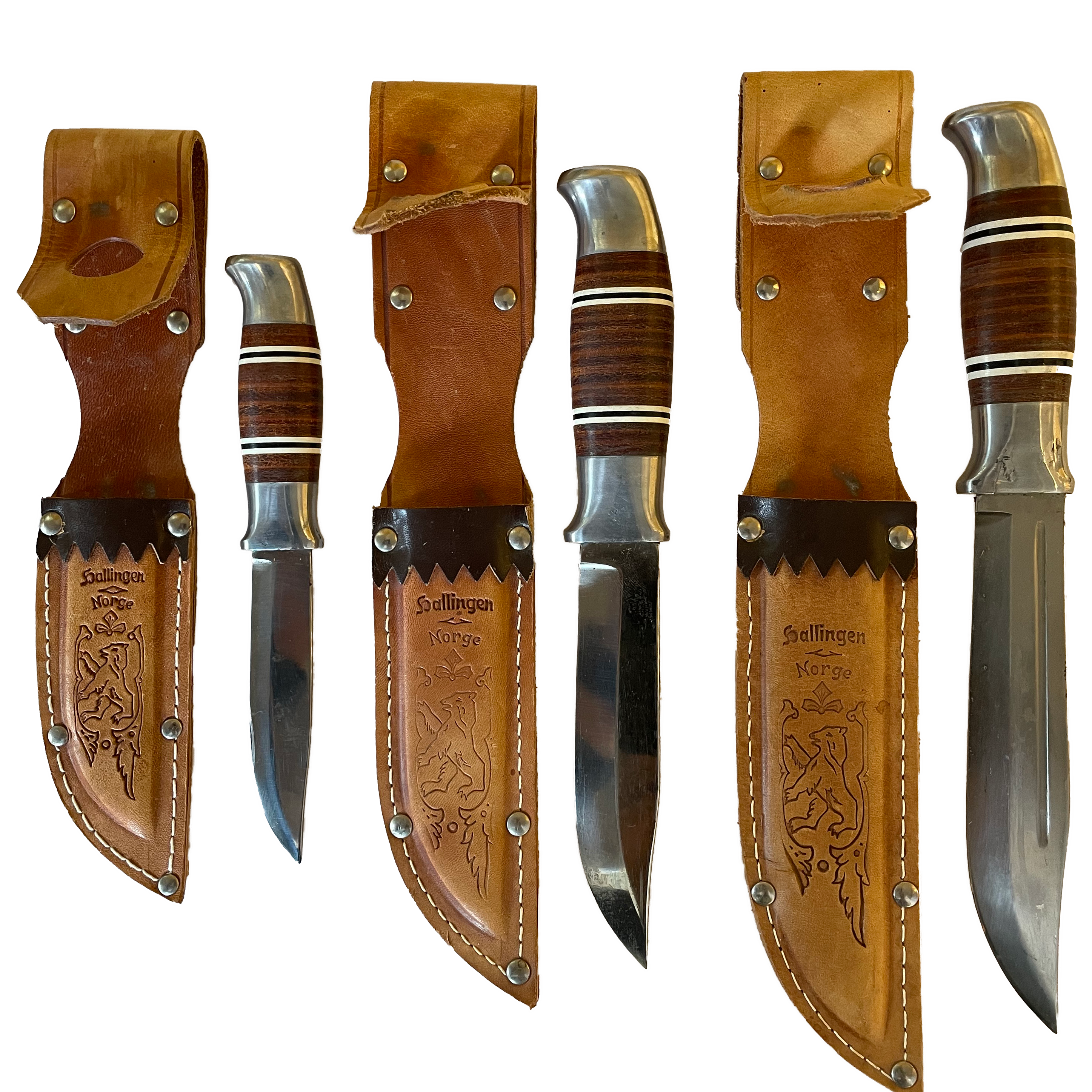 Læderet til Hallingens skaft var overskudslæder fra lokale skofabrikker. På den tid var der mange skofabrikker i Norge. Hallingen havde et unikt etui, der låste kniven fast ved en løkke over skaftet. Fra starten af 1990'erne blev der fremstillet nye skeder (flip etui), som blev produceret indtil Hallingen udfasedes i 1996.