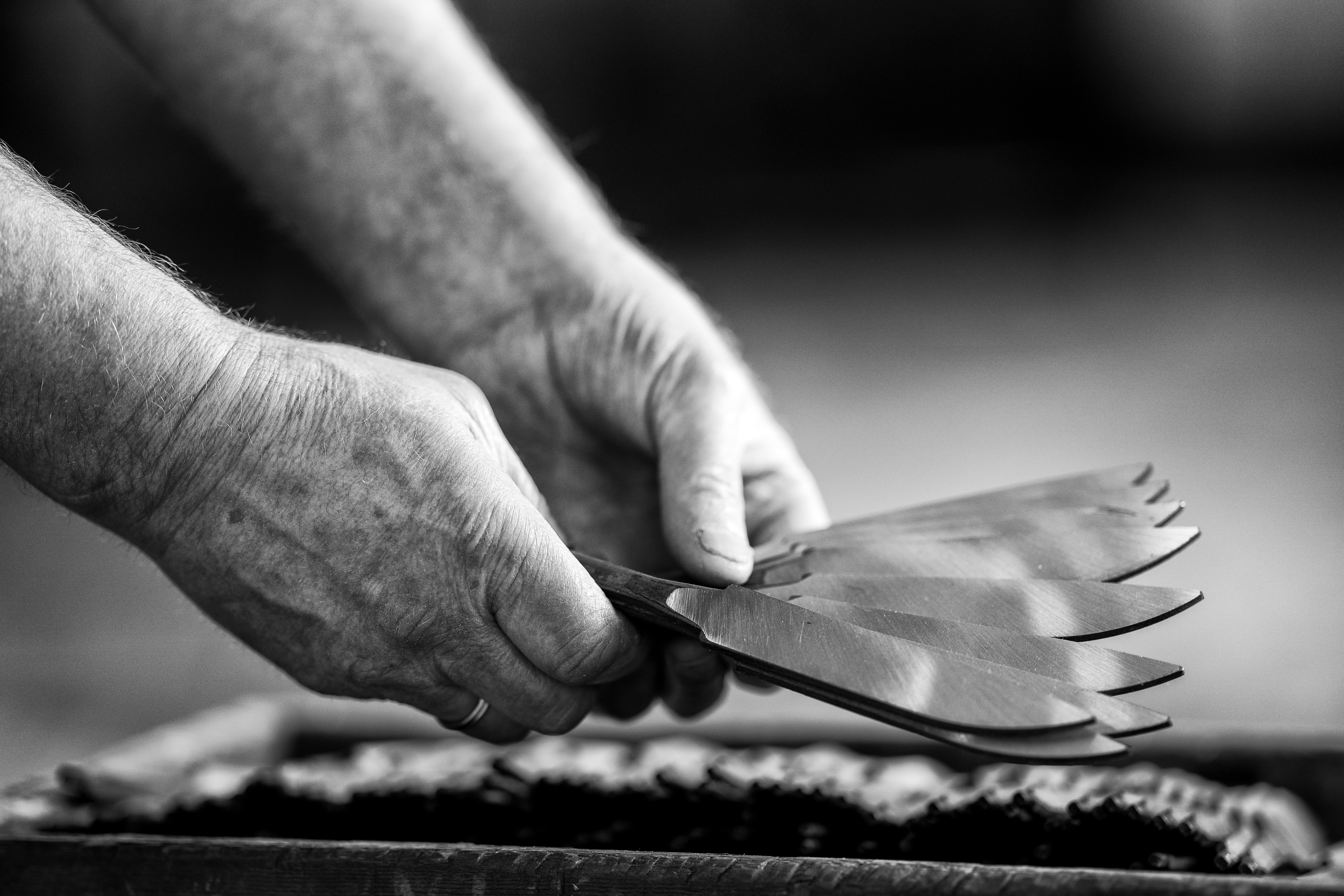 Det stål, vi anvender, er knivstål af høj kvalitet. Det er behandlet, udskåret og hærdet til optimal hårdhed. Knivene holder skarpheden længe, samtidig med at de er lette at slibe op igen, når det er nødvendigt.