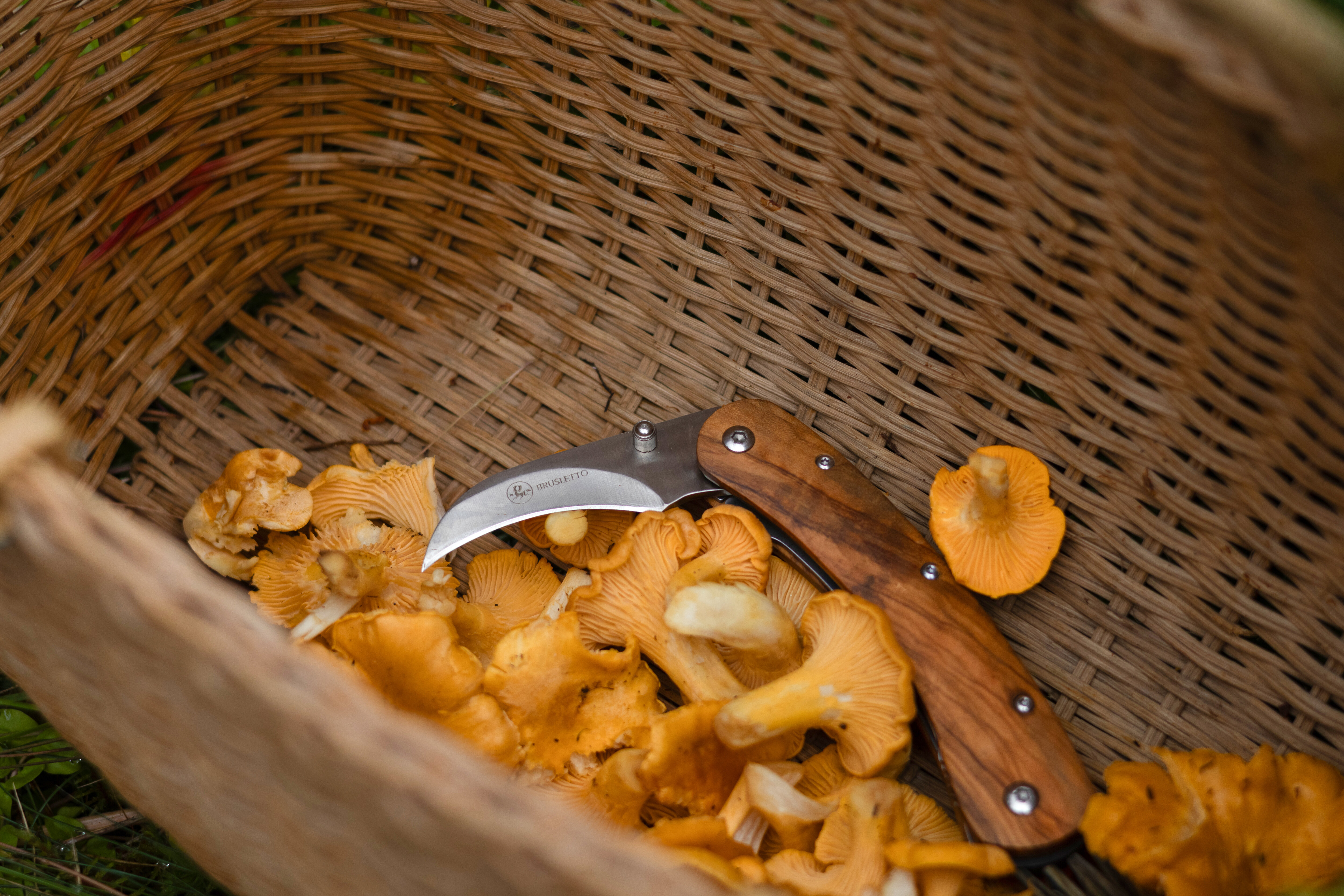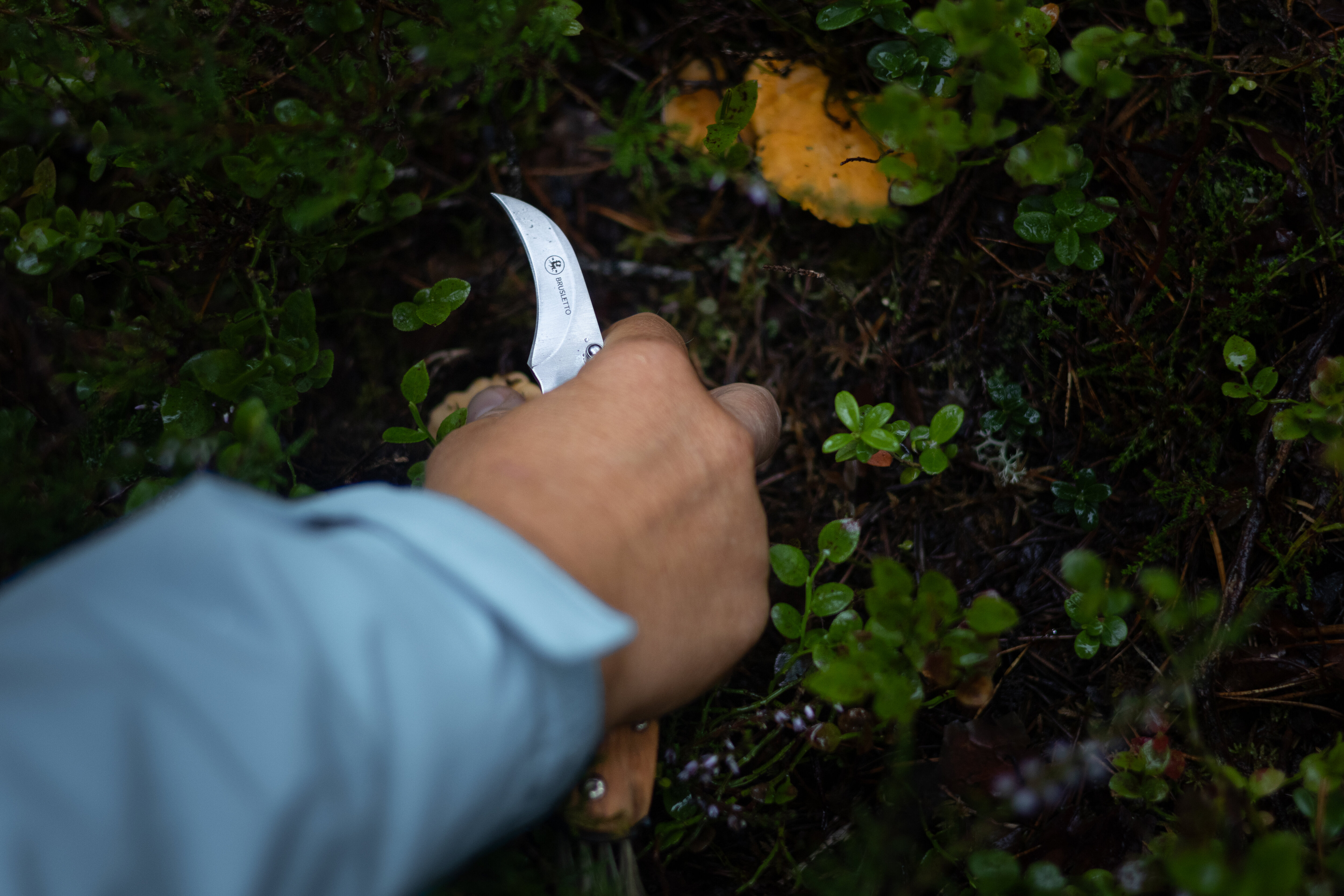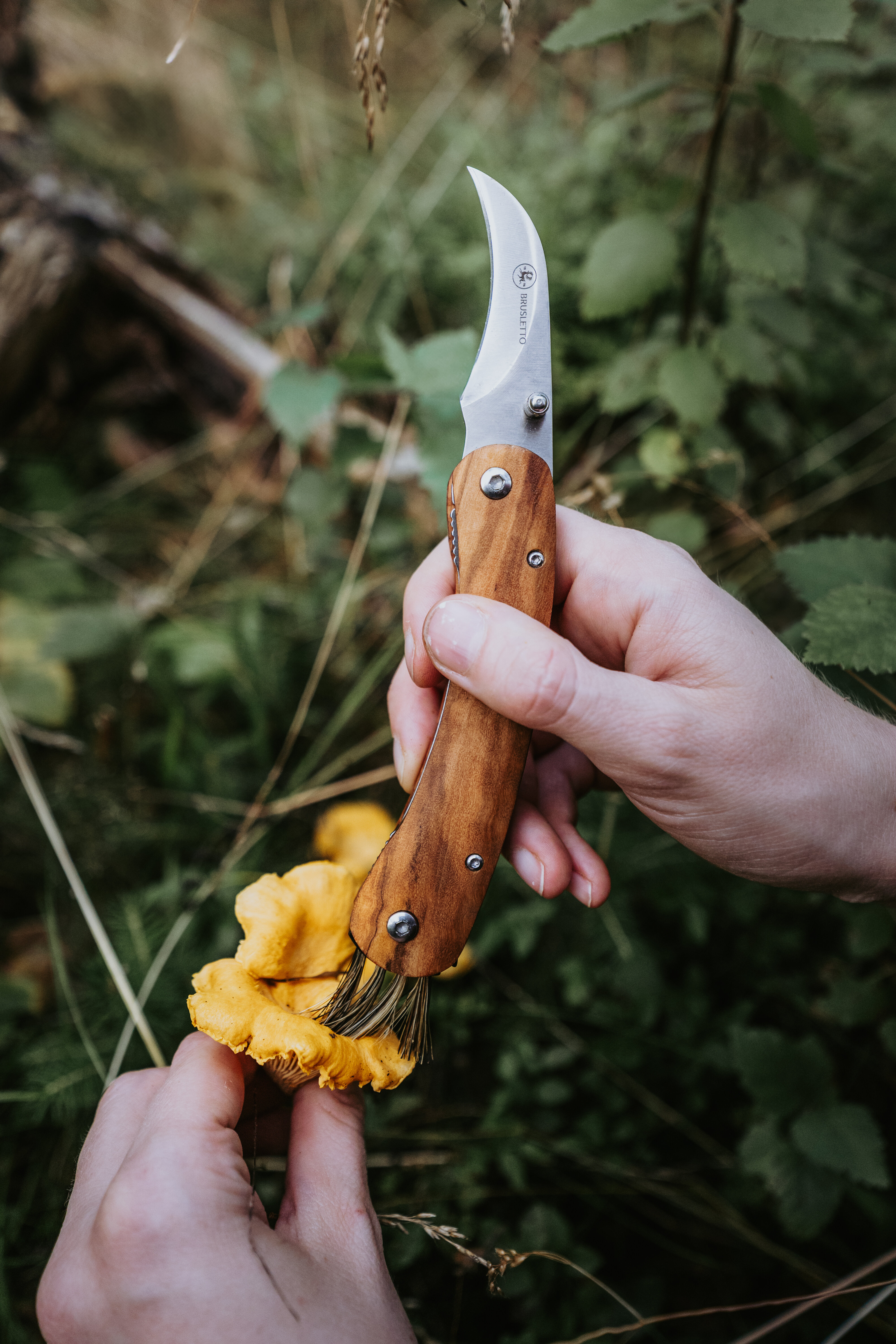 Vedalen svampekniv fra Brusletto er kompakt, har rund spids og børste, perfekt til at høste tæt ved roden.