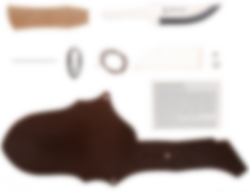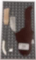 Læderstykke, nål, tråd, sikkerhedsindsats, groft formet fjeldbirkestykke, holk og Falken knivblad.